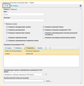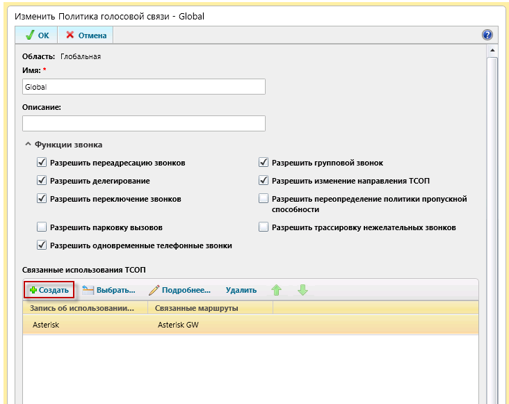 Далее заходим в Панель управления Lync Server -> Маршрутизация голосовой связи -> Политика голосовой связи: