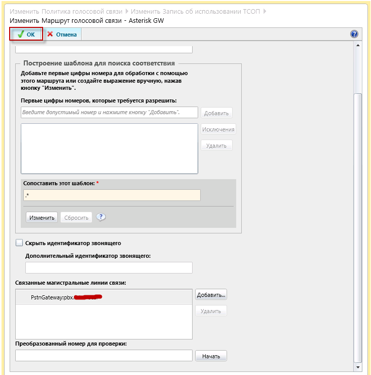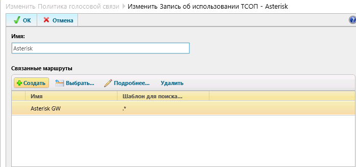 Указываем имя Asterisk GW далее указываем Связанные магистральные линии связи наш ТСОП шлюз который мы создали в топологии нажимаем ОК