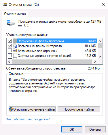 В зависимости от количества разделов на диске, появится либо выбор одного из них, либо сразу откроется список временных файлов и других элементов, которые можно очистить. По нажатию кнопки «Очистить системные файлы», можно будет также удалить некоторые дополнительные вещи с диска.